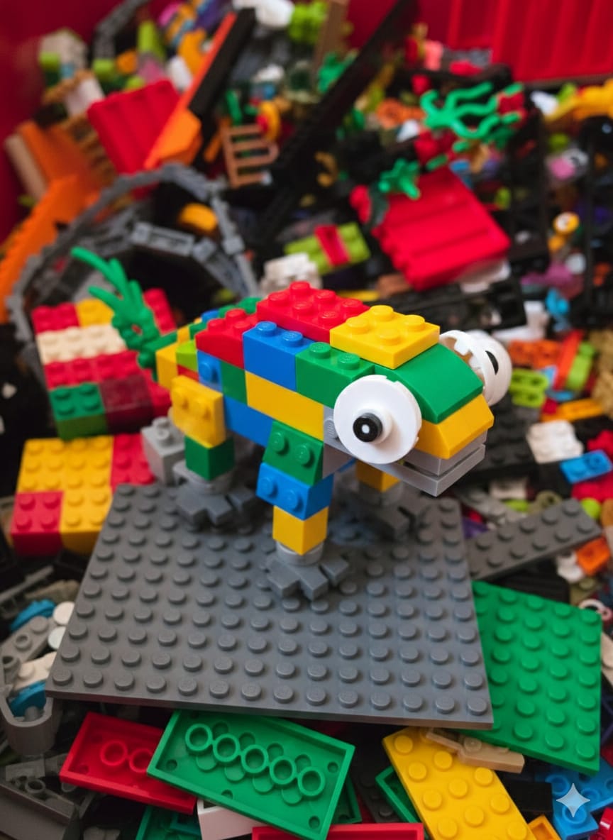 Een nieuwere manier van spelen is AI gebruiken als inspiratiebron. Zo kun je bijvoorbeeld aan Gemini vragen om een plaatje te maken van een diertje dat jullie na kunnen bouwen op basis van de legostukjes die jullie hebben. Hiervoor kun je een foto maken van je legobak.